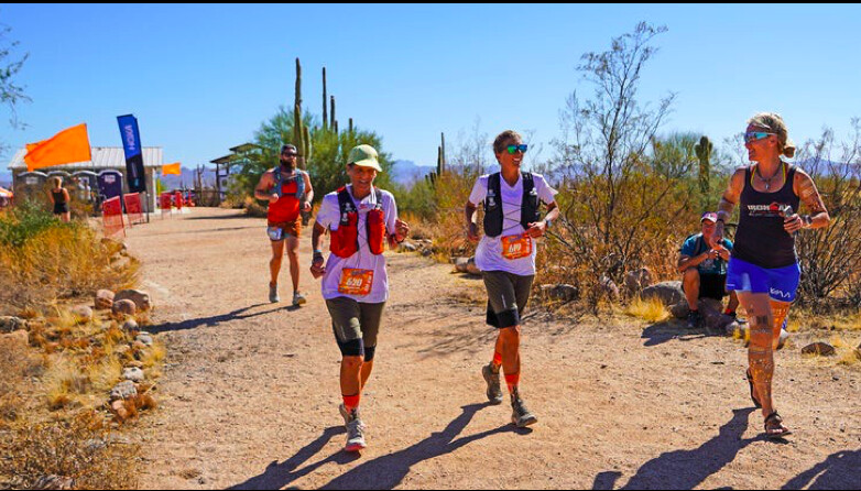 A dedicated team, the pair was running three loops side-by-side in matching long running shorts, white baggy tees, Salomon hydration vests, and cactus-themed socks, at the Halloween-themed Javelina Jundred 100K race. The ultrarunning event is held the closing weekend of October in the McDowell Mountain Regional Park, an hour northeast of Phoenix, Arizona. Temperatures can climb into the 90s by mid-morning and dip into the low 50s once daylight disappears behind the McDowell Mountain Range.