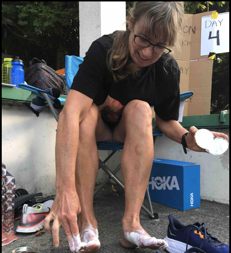 After 14 days of marathons, Michalofsky found herself facing injury–tibialis anterior tendonitis. She tried walking the distance in a walking cast, but that also become too painful. She didn’t want to quit, but knew she needed to take a few days off to heal. Michalofsky posted on social media, asking for people to come out and run for her. “I was flabbergasted when over 20 people showed up in a single day. Some of them were runners from my running community, some were friends and family members, and most amazingly, some were people who had seen my story on the news,” she says.