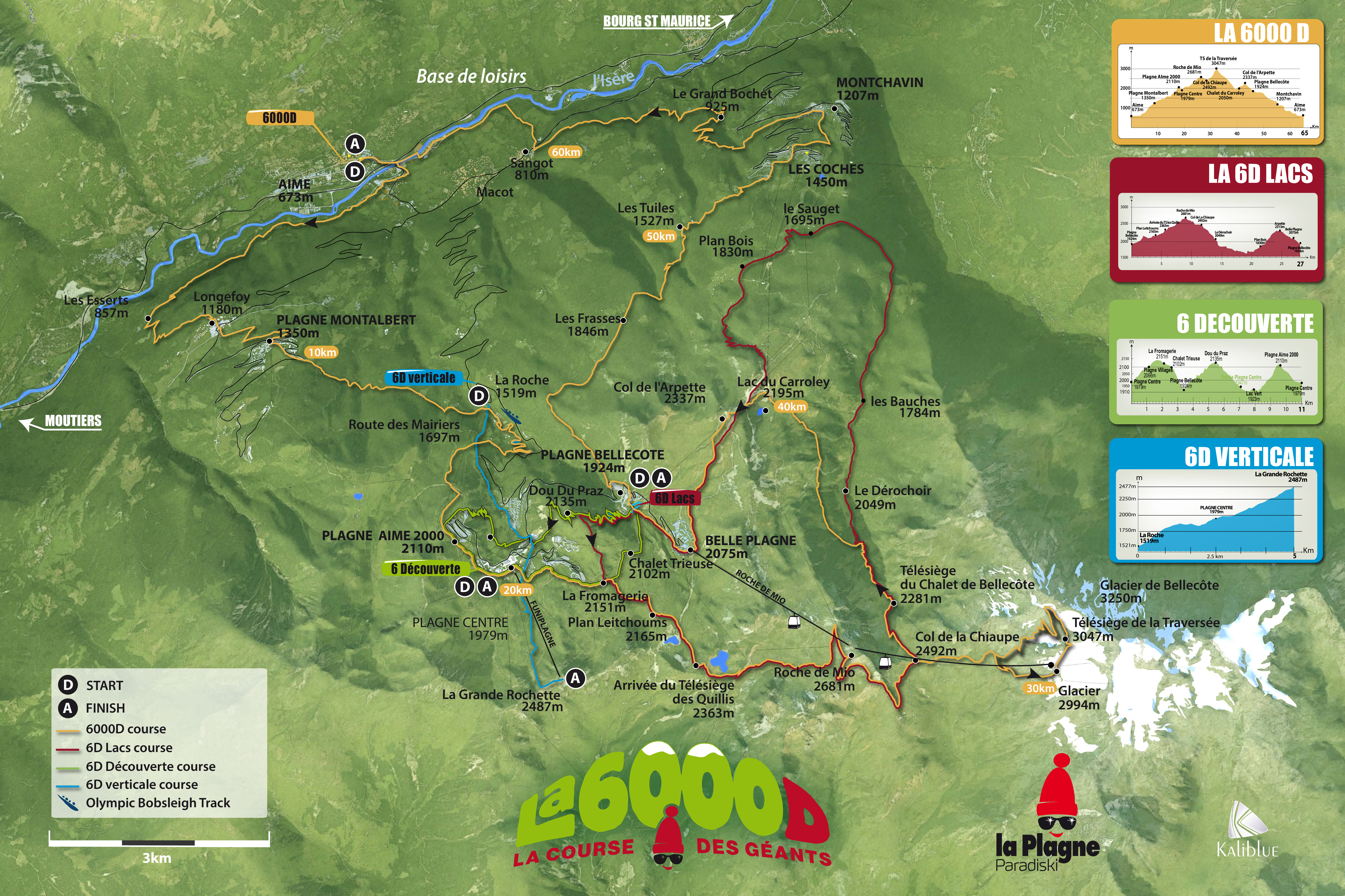 3500m of elevation gain over a 65km course that takes participants from the village of Aime in the valley to the top of Bellecôte glacier at 3047m via La Plagne's different altitude villages, then coming back down through the forest to Montchavin and finishing along the Isère river.