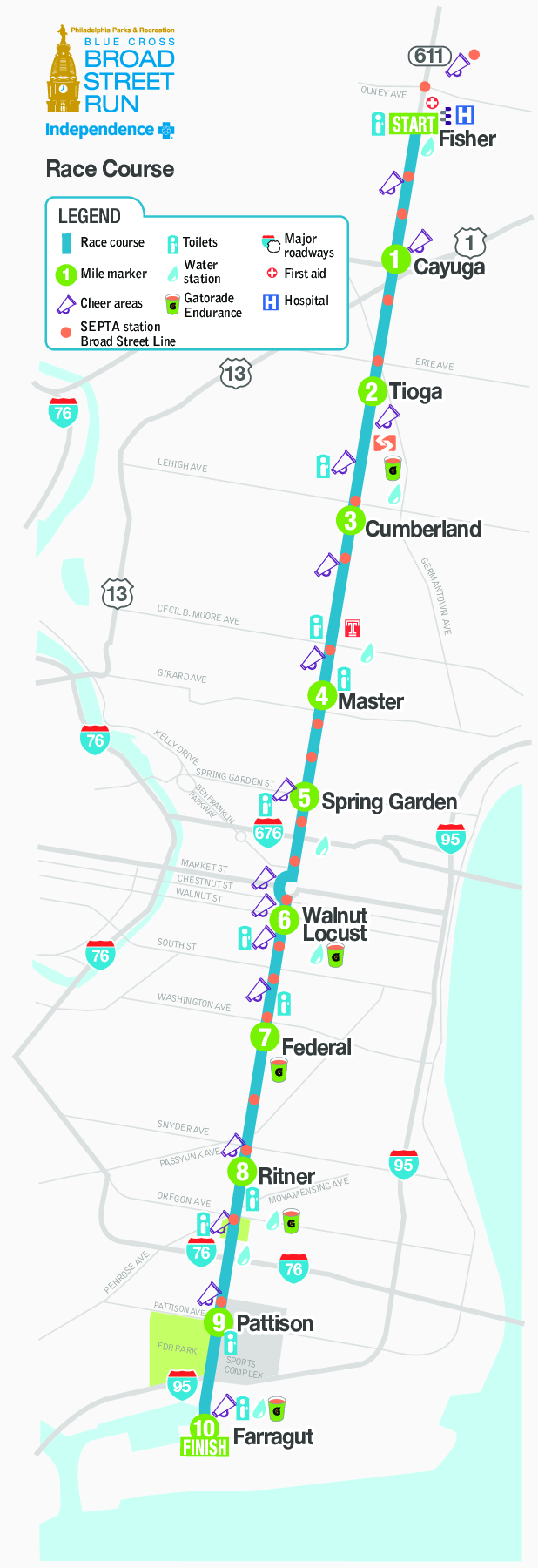 The Blue Cross Broad Street Run course is a 10-mile, point-to-point course (named one of the fastest 10-mile courses in the country by Runner's World) starts at the Central High School Athletic Field at Broad Street and Somerville Avenue. The course is a pleasing run past the varied neighborhoods of Philadelphia along Broad Street. The race finishes inside the Philadelphia Navy Yard at the end of Broad Street in South Philadelphia.