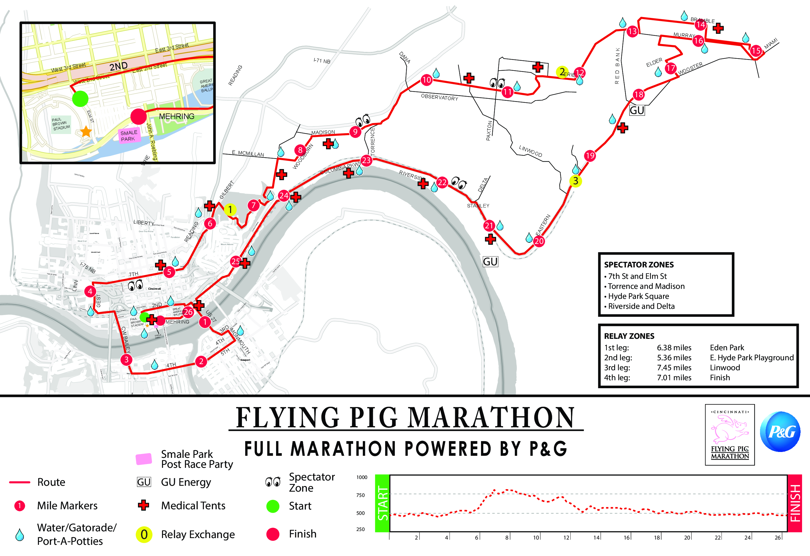 The Cincinnati Flying Pig Marathon is a beautiful course, which “flies” along the streets of Cincinnati, Covington, Newport, Mariemont, Fairfax and Columbia Township. Our course presents a well-balanced, diverse tour of some the best neighborhoods in the area.