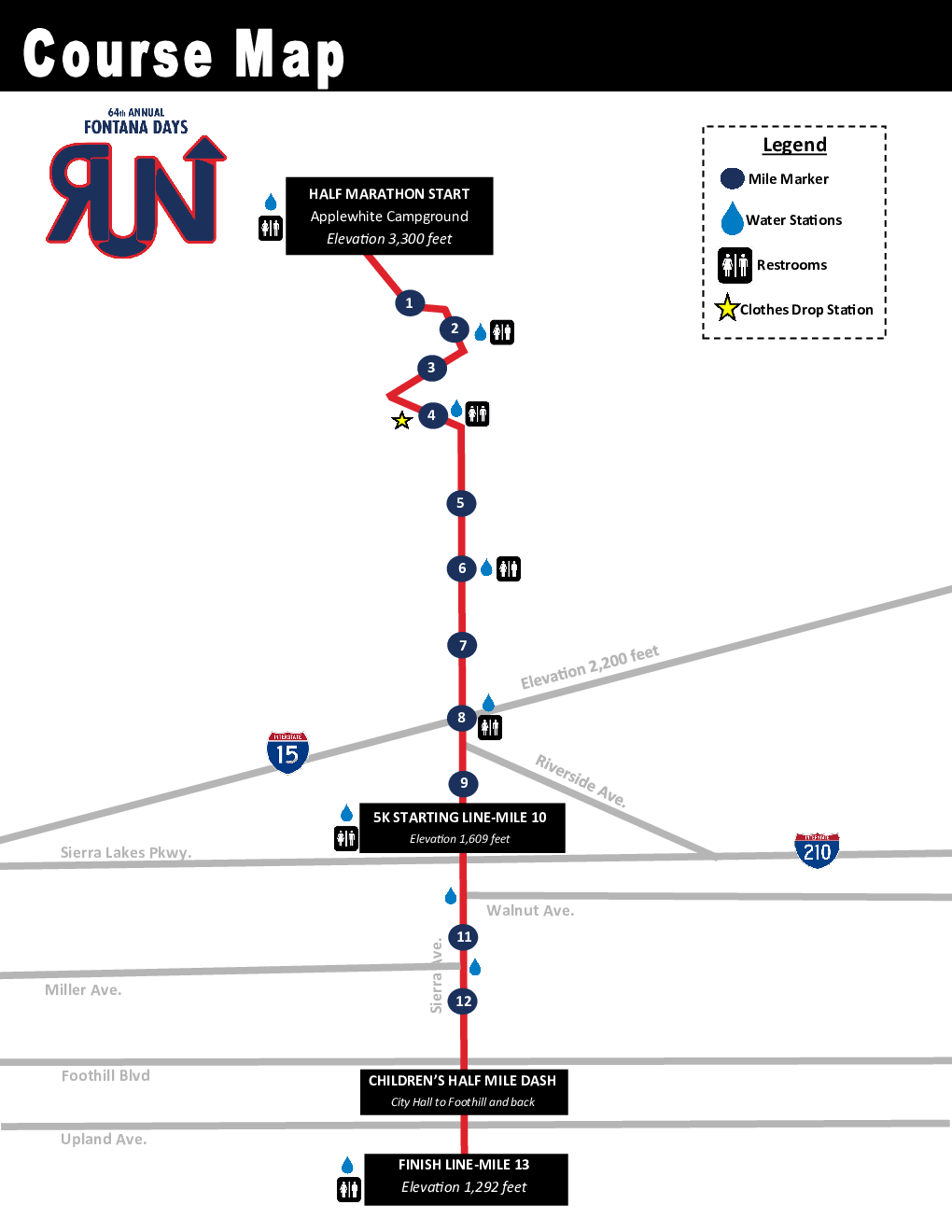 Recognized as the World’s Fastest Half Marathon Course by the USATF in 1985. The Half Marathon starting line is located at the Applewhite Campground in Lytle Creek. The first 6 miles of the Half Marathon include fast and steep, downhill running through the scenic San Bernardino National Forest and Lytle Creek Community. The last 7.1 miles of the course are also fast, but more of a moderate to gradual downhill run along Sierra Avenue towards Fontana City Hall. There is an elevation drop of 2,125 feet from start to finish.
