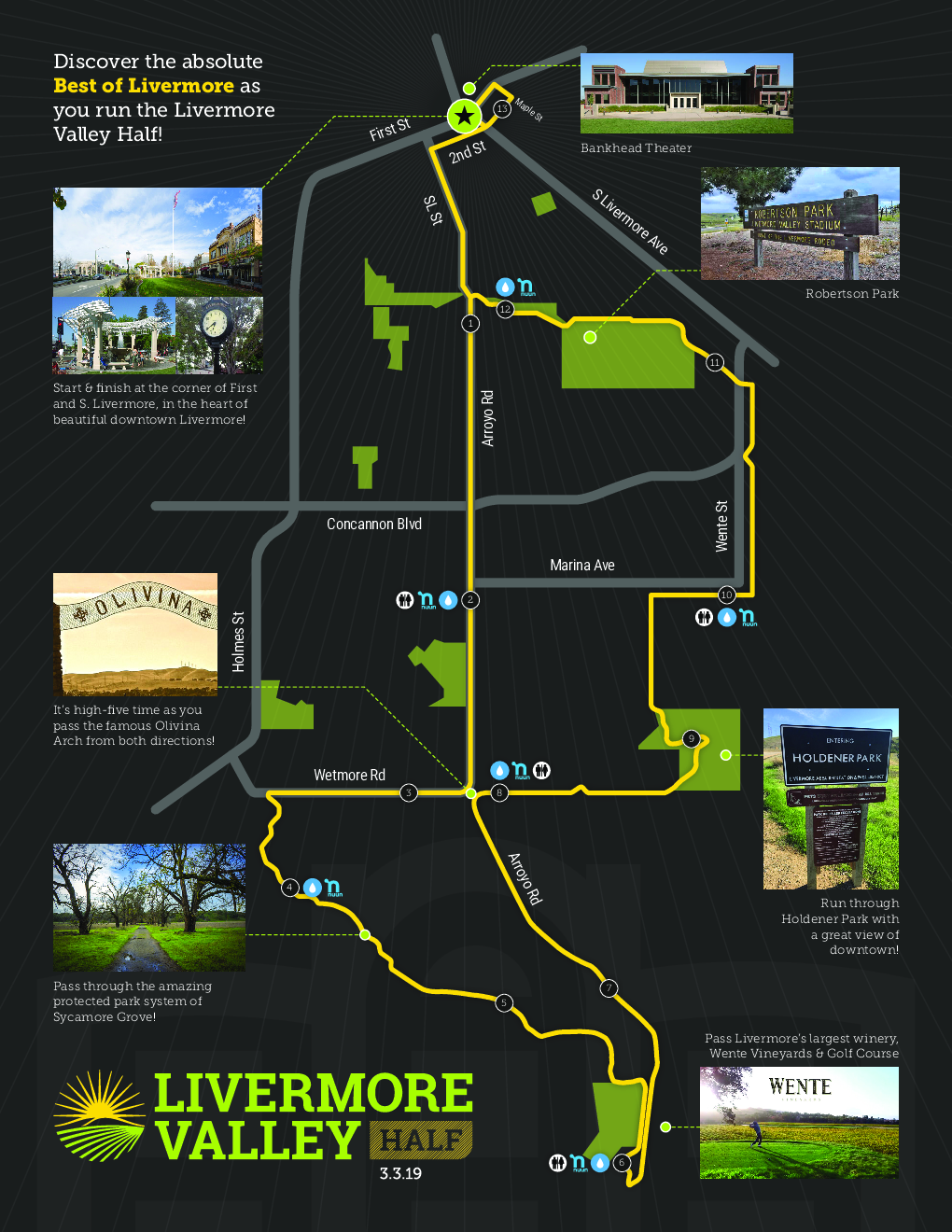 Gear check will be available near the start line for your pre-race/post-race clothing. While you run, it’ll be held securely while you experience a grand tour of Livermore. When you finish, simply return to the same location to claim your belongings.