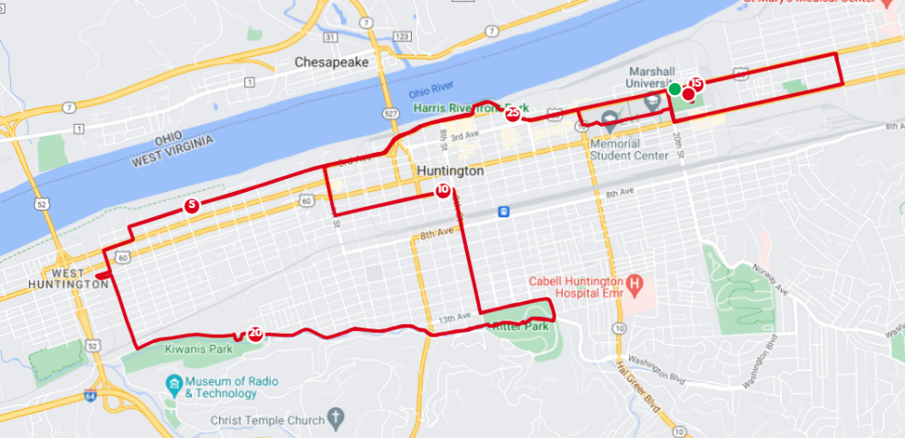 The course is flat and fast and USATF certified (WV23001MS). It is a perfect course to run to qualify for Boston. Runners start on 3rd Avenue next to Joan C. Edward Stadium and run through downtown Huntington past Pullman Square, next to the Ohio River, and through Ritter Park among other places. The highlight is to run through Marshall University campus on their way to a goal-line finish in Marshall Football Stadium.